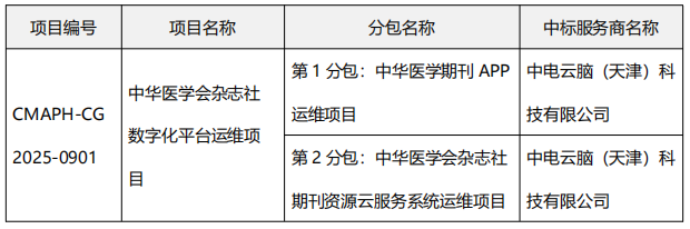 “中华医学会杂志社数字化平台运维项目”进行公开招标,依照公平、公正、公开的原则,经过开标会专家评标并报《中华医学杂志》社有限责任公司社长办公会通过,现对中标服务商公示如下: